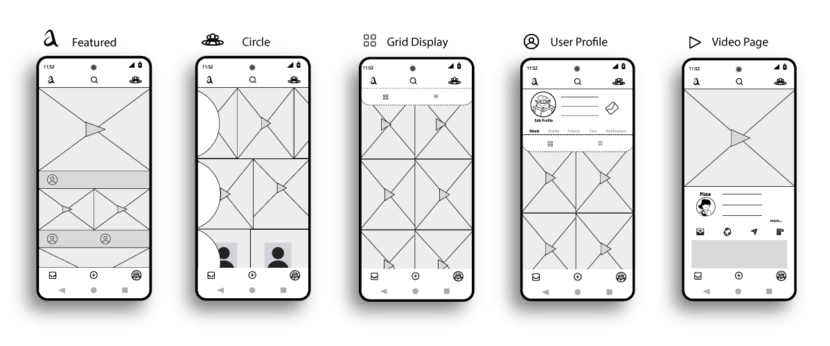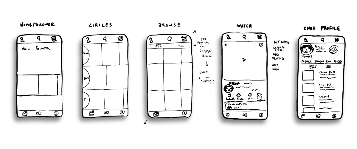 These are the main screens from the initial wireframe sketches, starting out with a design convention similar popular video apps, with scrolling rows and grids of suggested content.