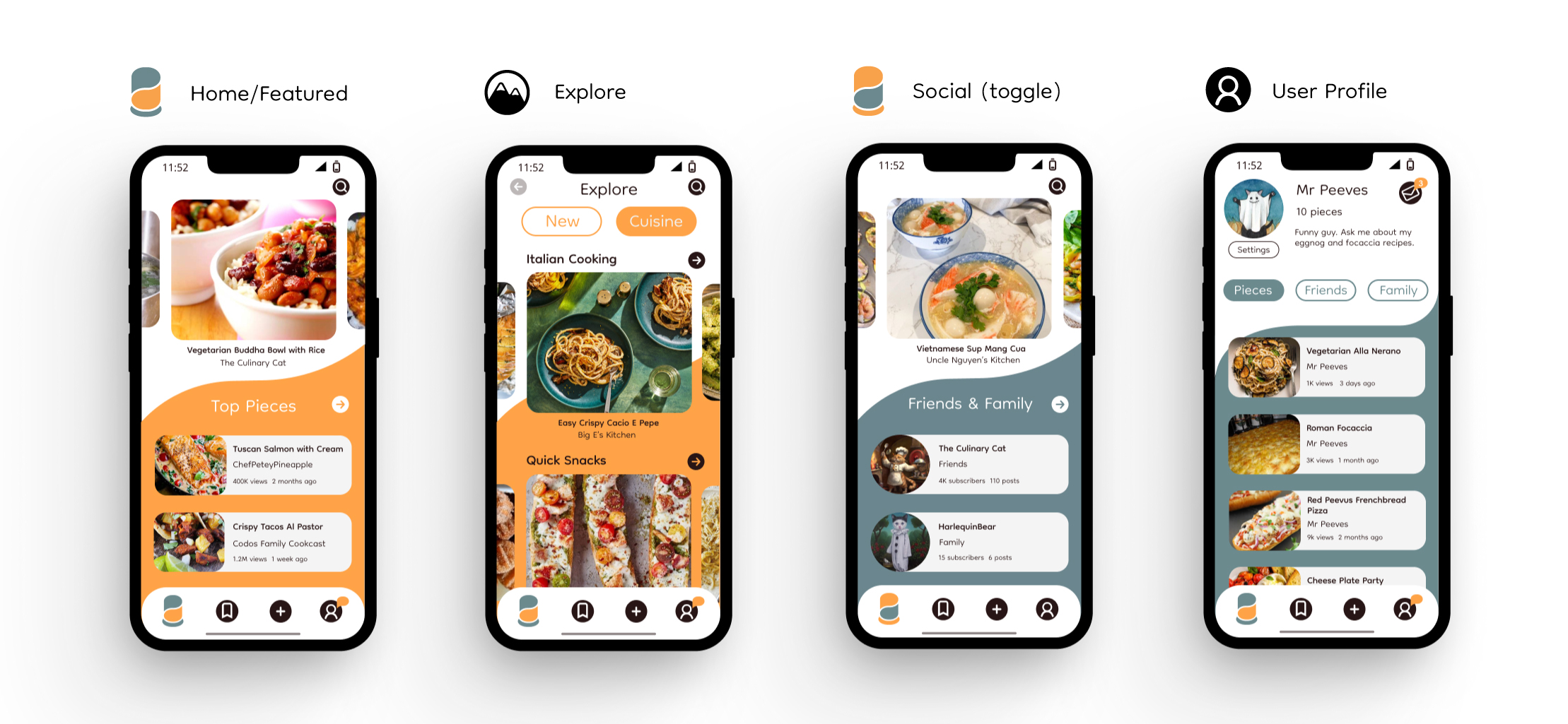 The Home and Social pages are the two main starting points of the design. The app logo that functions as a Home screen return on most sites and apps was given a toggle feature, to jump between the two main paths of the design flow, with corresponding color change in the visuals.